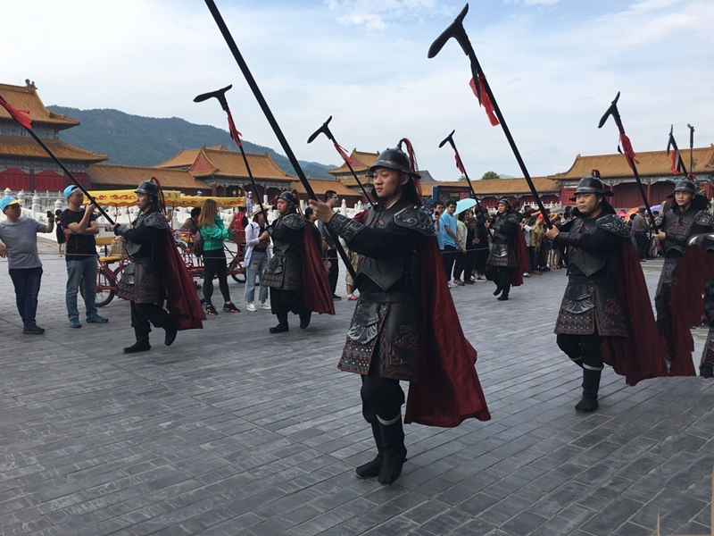 明清宮苑,是橫店影視城目前最大的影視基地。按照北京故宮1:1克隆的建筑,氣勢依舊磅礴恢宏,假裝在北京,相信一定會有人信。小伙伴們在這里先后欣賞了八旗馬戰(zhàn)、花車巡游等精彩演出,還遇到了劇組在此取景拍攝。